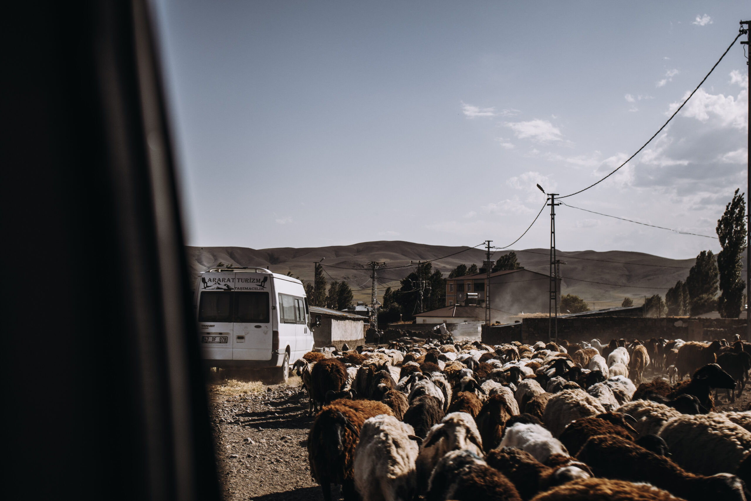 De volgende dag worden we met busjes naar het startpunt van de expeditie gebracht, waar onze duffels worden overgeladen op paarden. Terwijl de dieren in kuddes uitzwermen over de berg gaan we zelf te voet verder naar kamp 1, dat zich op zo’n 3400 meter hoogte bevindt en aanvoelt als een soort minidorpje van koepeltenten. Diep onder ons strekken de valleien van Oost-Turkije zich uit. Glooiend, goudgeel en verlaten op slechts enkele kleine huisjes na. Hier en daar werpen kuddes geiten stofwolken op. Kleine tekens van leven, in de schaduw van de berg.