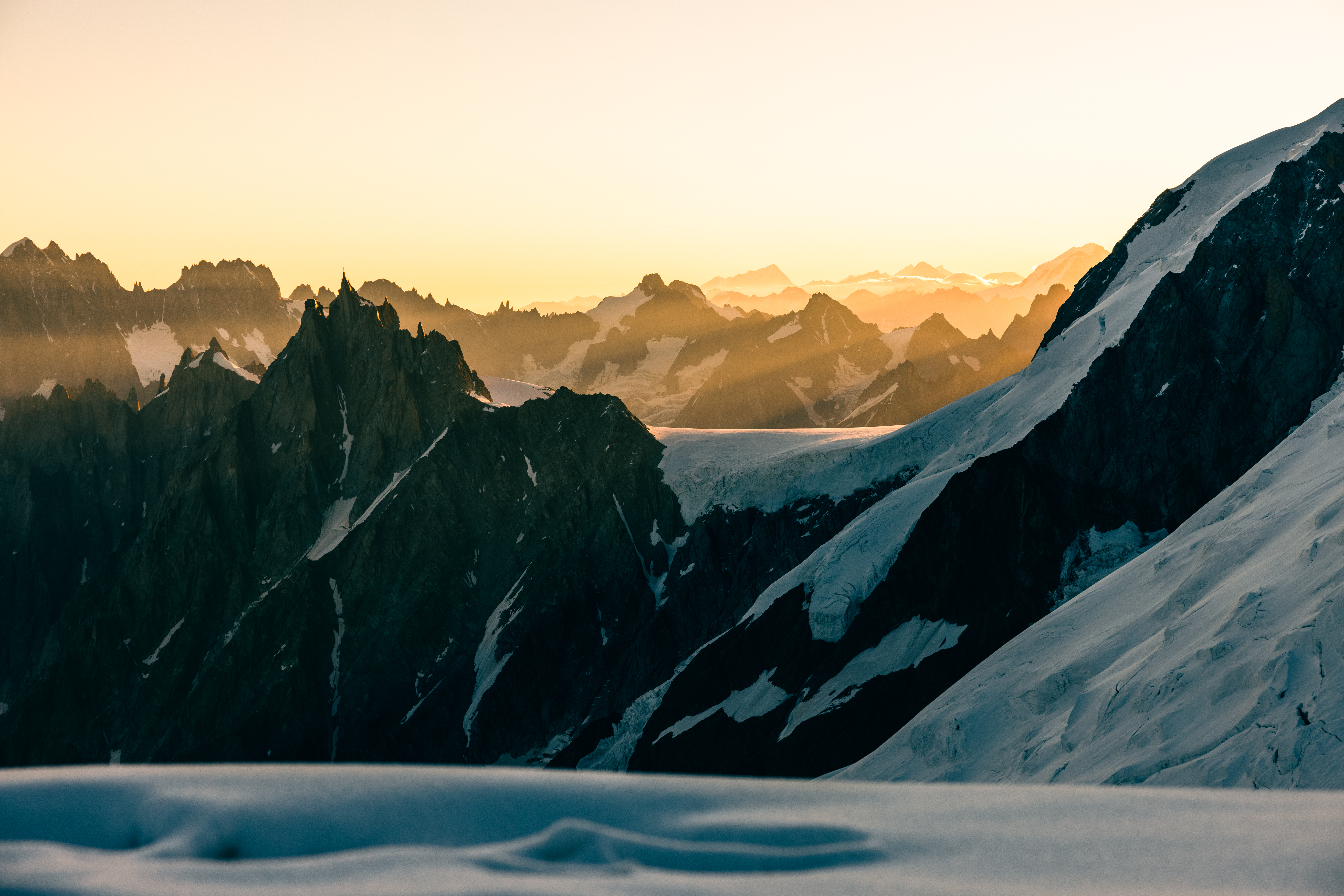 De zonsopkomst blijft altijd mijn favoriete moment. Tijdens die expeditie zagen we de Aiguille du Midi oplichten in het eerste zonlicht. Dat beeld is nog steeds een van mijn favorieten van die reis.