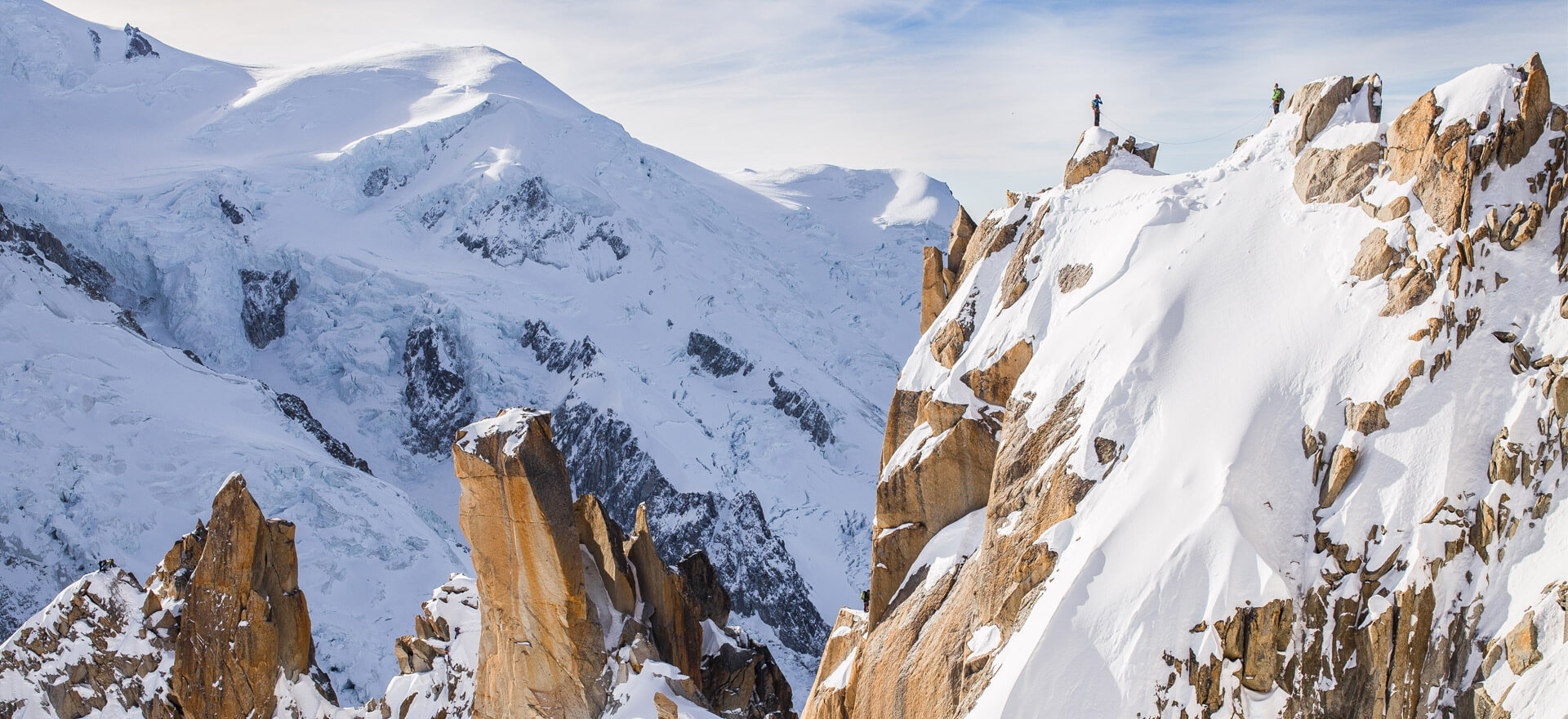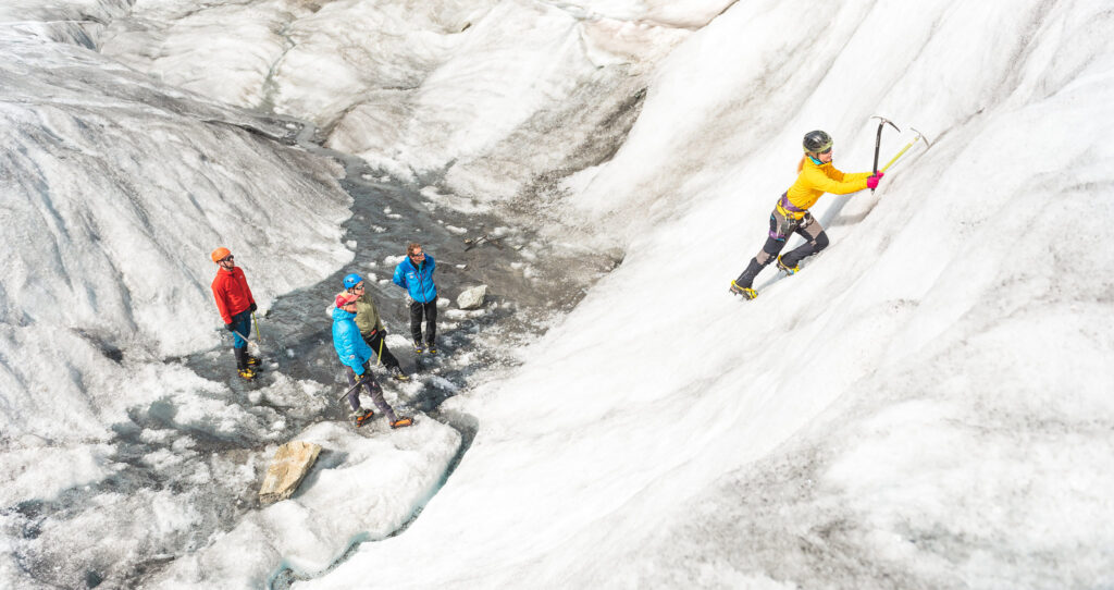 Een eerste beklimming met gids is vaak een korte expeditie of klassieker waar je de basishandelingen leert: lopen met stijgijzers, zekeren, tempo houden.
