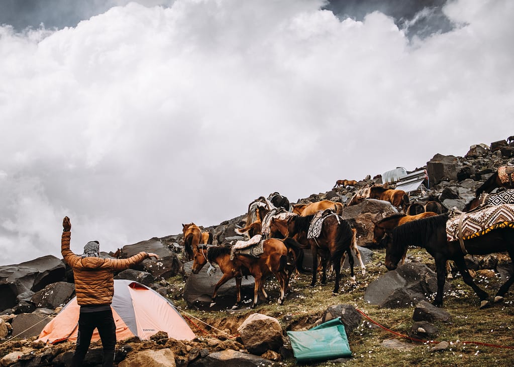 Op de berg hoef je niet al je bagage zelf te dragen. Je kan maximaal 15kg aan bagage in een duffel afgeven. Dit wordt met paarden naar het volgende kamp vervoerd.
