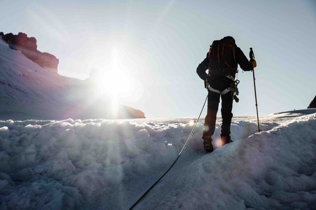 Er worden touwen gebruikt om gletsjers over te steken. Het terrein wordt wat steiler (<40 graden) met mogelijk 2e graads rotsterrein.