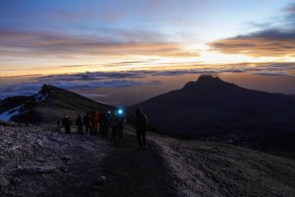 Rond middernacht word je gewekt door de gidsen. Je eet en drinkt nog snel wat en dan vertrekken we naar de top. Een lichte rugzak met alleen wat kleding, eten en drinken en een hoofdlampje op je hoofd is het enige dat je bij je draagt. Een steil puinpad leidt ons in een gestaag tempo naar de kraterrand waar we met zonsopgang verwachten aan te komen. Bij Stella Point op 5739 meter rusten we uit en genieten van de zon die langzaam opkomt.