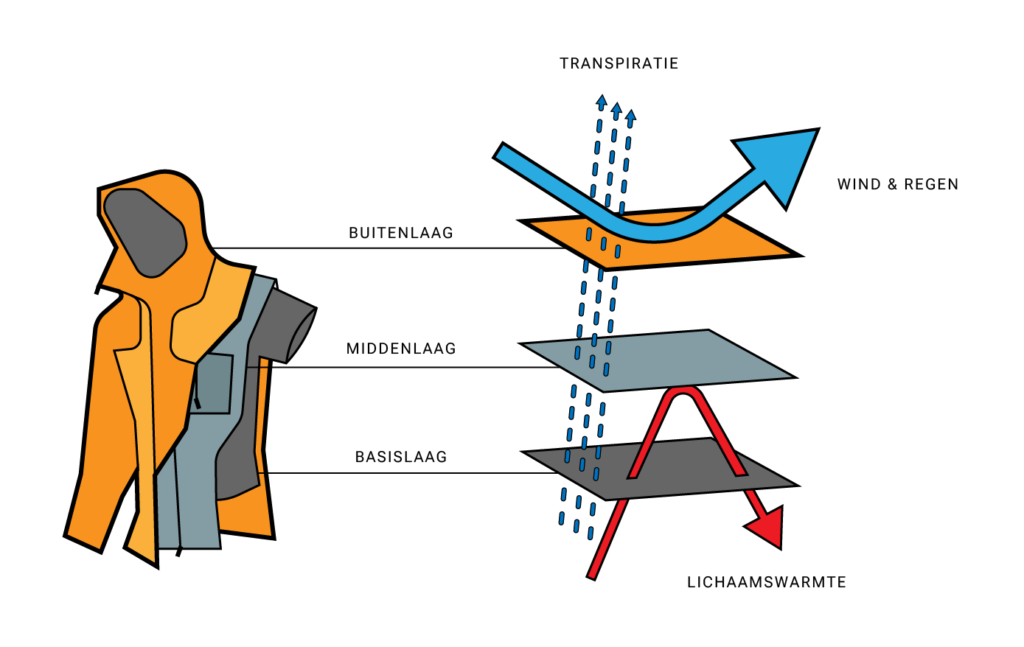 Veel mensen denken bij alpinisme meteen aan één dikke jas. In de praktijk werk je bijna altijd met een lagensysteem. Kleding verdelen we weer in drie groepen: Je basislaag voert vocht af, je tussenlaag zorgt voor warmte en je buitenlaag beschermt tegen wind, sneeuw en neerslag. Voor koude momenten of langere stilstand neem je daarbovenop vaak nog een extra isolatielaag mee, zoals een dons- of synthetische jas.
